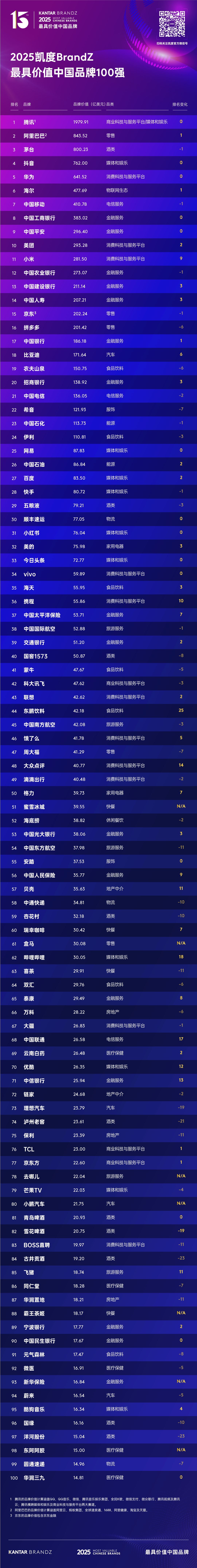 阿里巴巴以 23% 的增速实现品牌价值 843.52 亿美元(现汇率约合 5988.78 亿元人民币),重新夺回亚军宝座。白酒巨头茅台以 800.23 亿美元(现汇率约合 5681.43 亿元人民币)品牌价值稳居季军,抖音品牌价值飙升 34% 至 762.00 亿美元(现汇率约合 5410.01 亿元人民币),保持第四名。华为表现尤为亮眼,品牌价值同比增长 56% 达 641.52 亿美元(现汇率约合 4554.63 亿元人民币),不仅稳居总榜第五位,更跻身年度价值增长领先品牌前四强。海尔(第 6 名,477.69 亿美元)通过深化生态品牌战略,进一步巩固了其在物联网生态的领导地位。