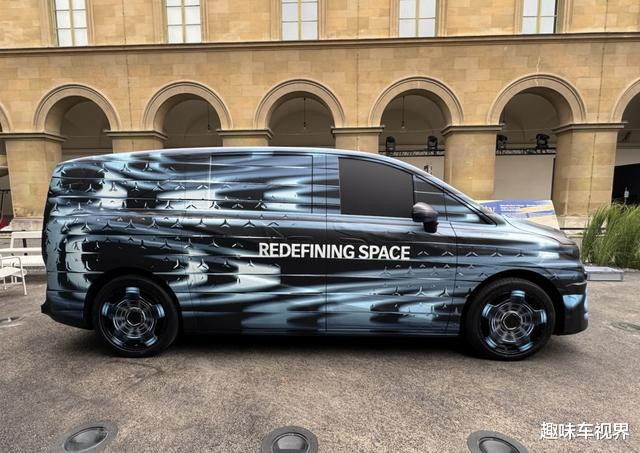 车身侧面,线条自然流畅,保了Vision V概念车的车身轮廓,D 柱区域的侧窗线条呈下滑趋势,让整车多了几分动感。侧滑门是 MPV 车型的标志性设计,同时,车辆配备了隐藏式门把手,不仅提升了外观的整体性,还进一步降低了风阻系数。车身贴纸带有 “REDEFINING SPACE” 字样,预示着车内空间将有出色表现。来到车尾,由于伪装覆盖,具体设计暂不明确,但预计会采用与前脸相呼应的设计风格,延续奔驰品牌的豪华大气。