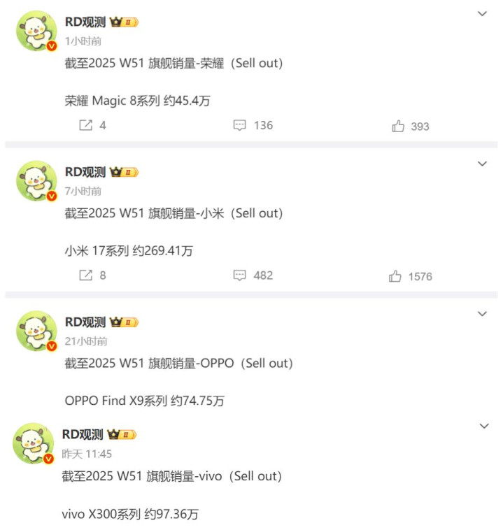 首先来看下核心销量数据,截至2025 W51,小米17系列约269.41万、vivo X300系列约97.36万、OPPO Find X9系列约74.75万、荣耀Magic 8系列约45.4万。